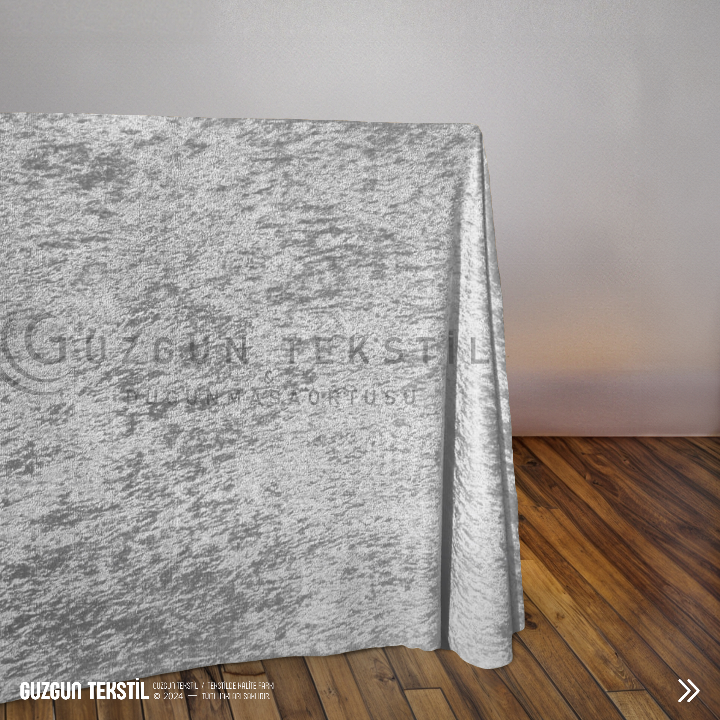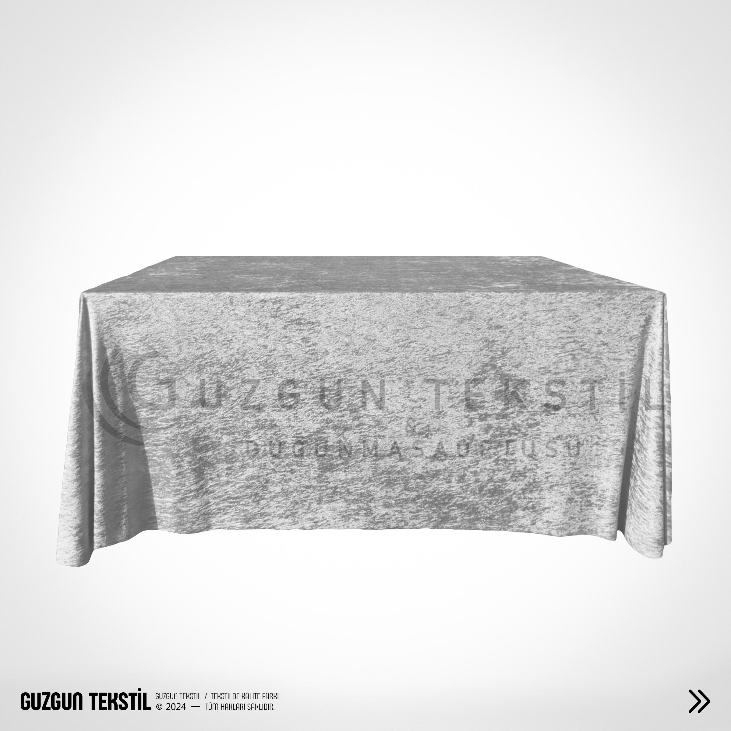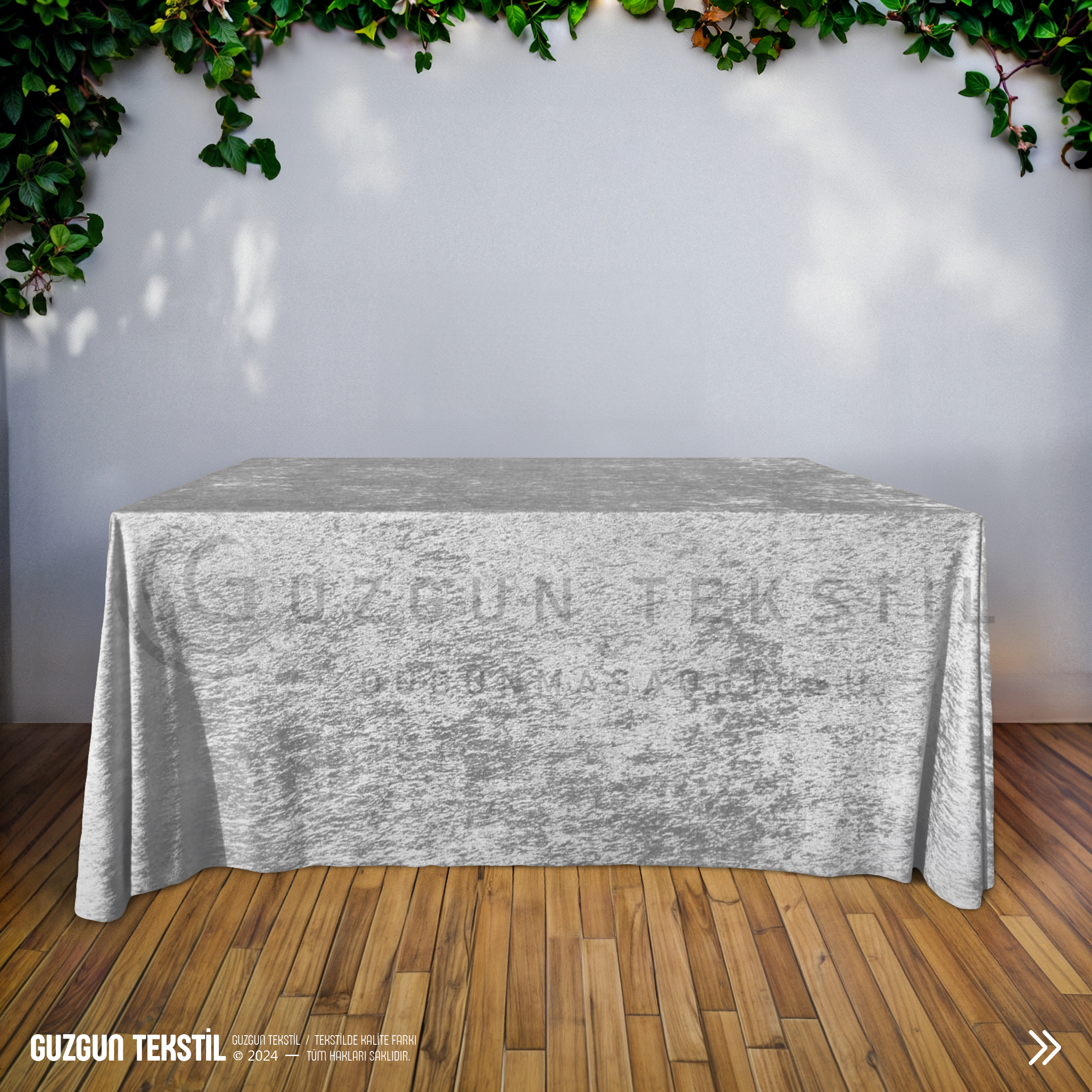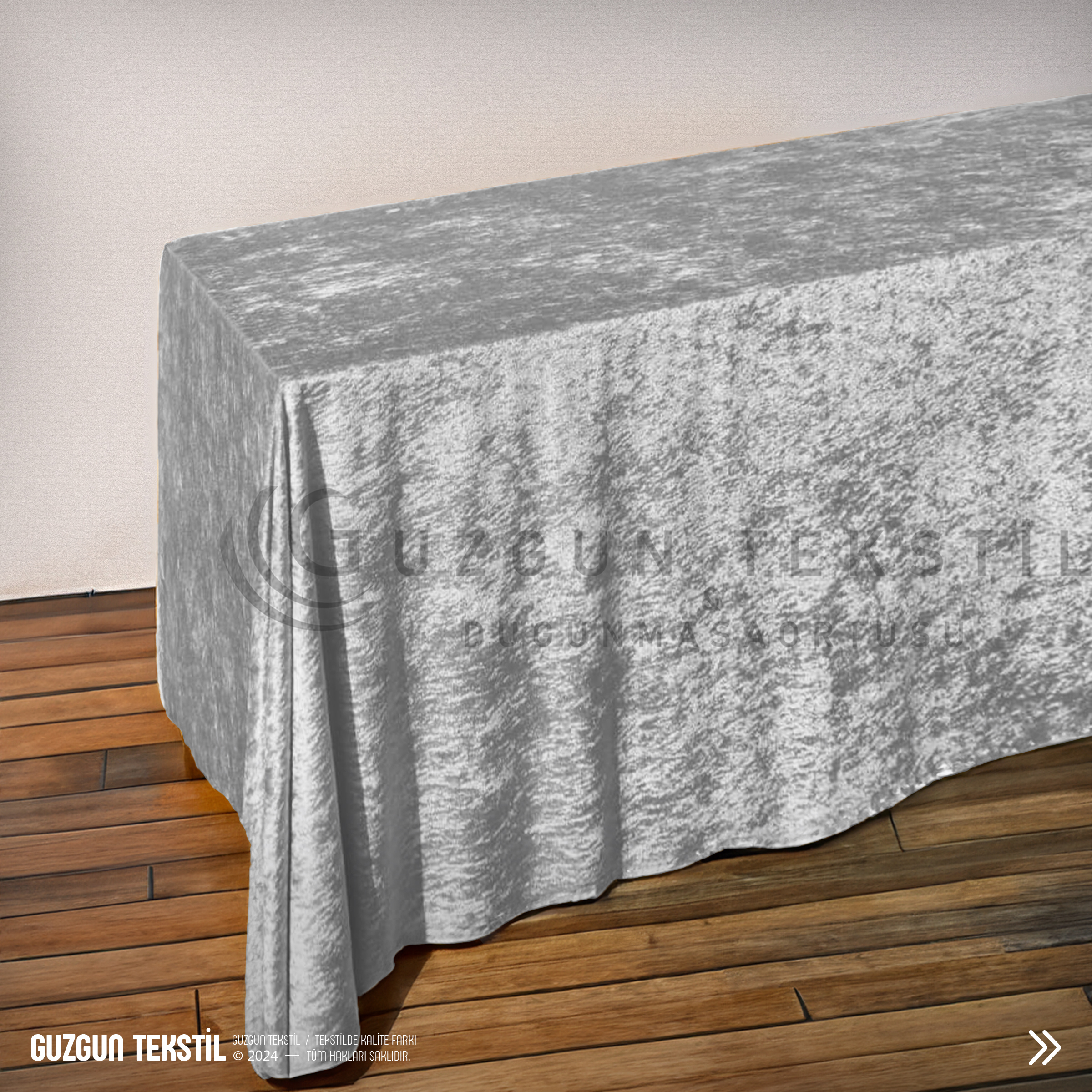 Açık gri dikdörtgen kadife masa örtüsü, zarif ve modern rengiyle düğün, davet ve özel organizasyonlarda masalarınıza şıklık katar.